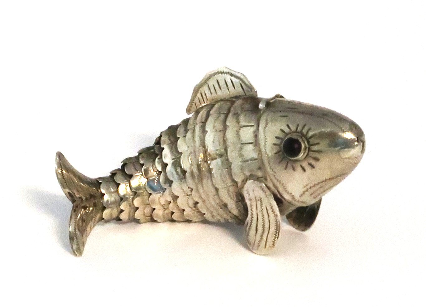 Fritz Sophus Albertus. Sølv hovedvandsæg i form af en fisk med røde flusser. Længde 8,5 cm