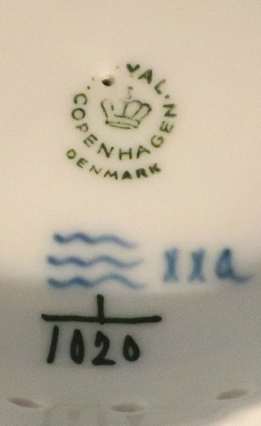 Royal Copenhagen. Musselmalet, helblonde. Kageskål på fod. Model 1020. Højde 14,5 cm. Diameter 20,5 cm. (1 sortering)