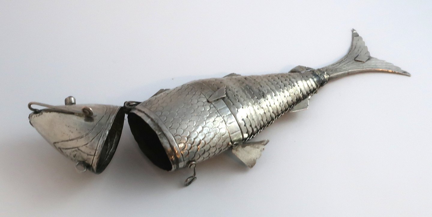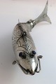 Sølv hovedvandsæg i form af stor fisk med blå sten. Længde 23,5 cm