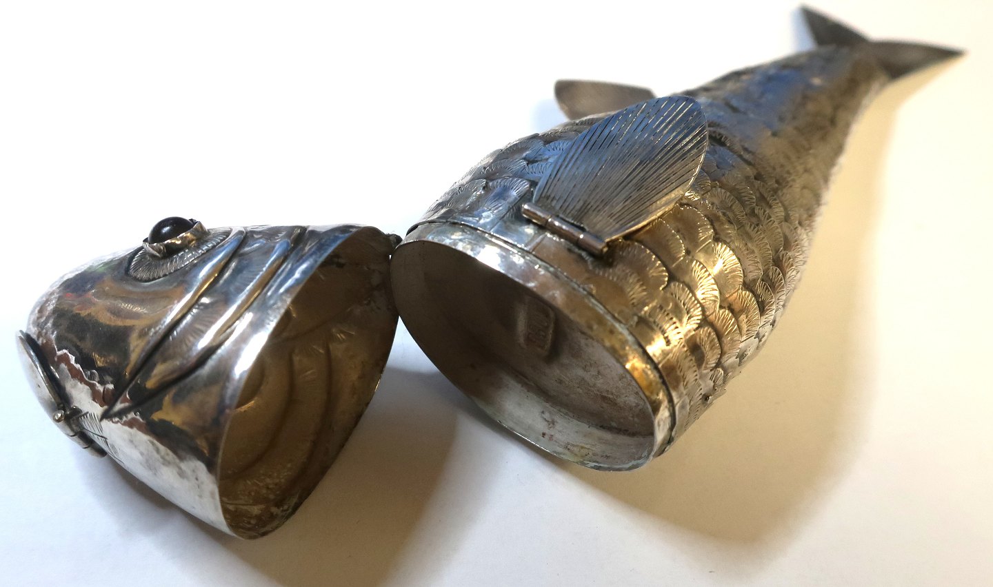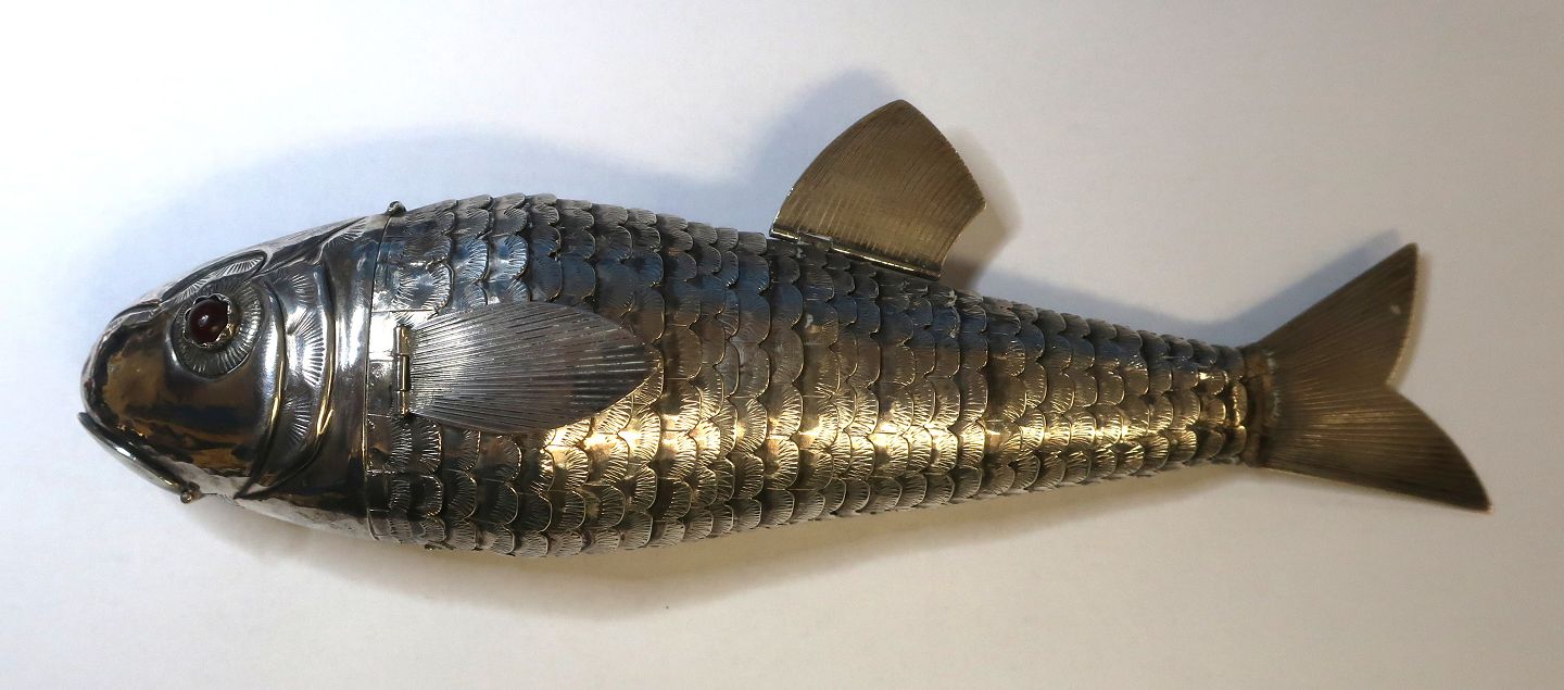 Silbernes vinagrette in Form eines Fisches mit roten Steinen. Länge 17 cm